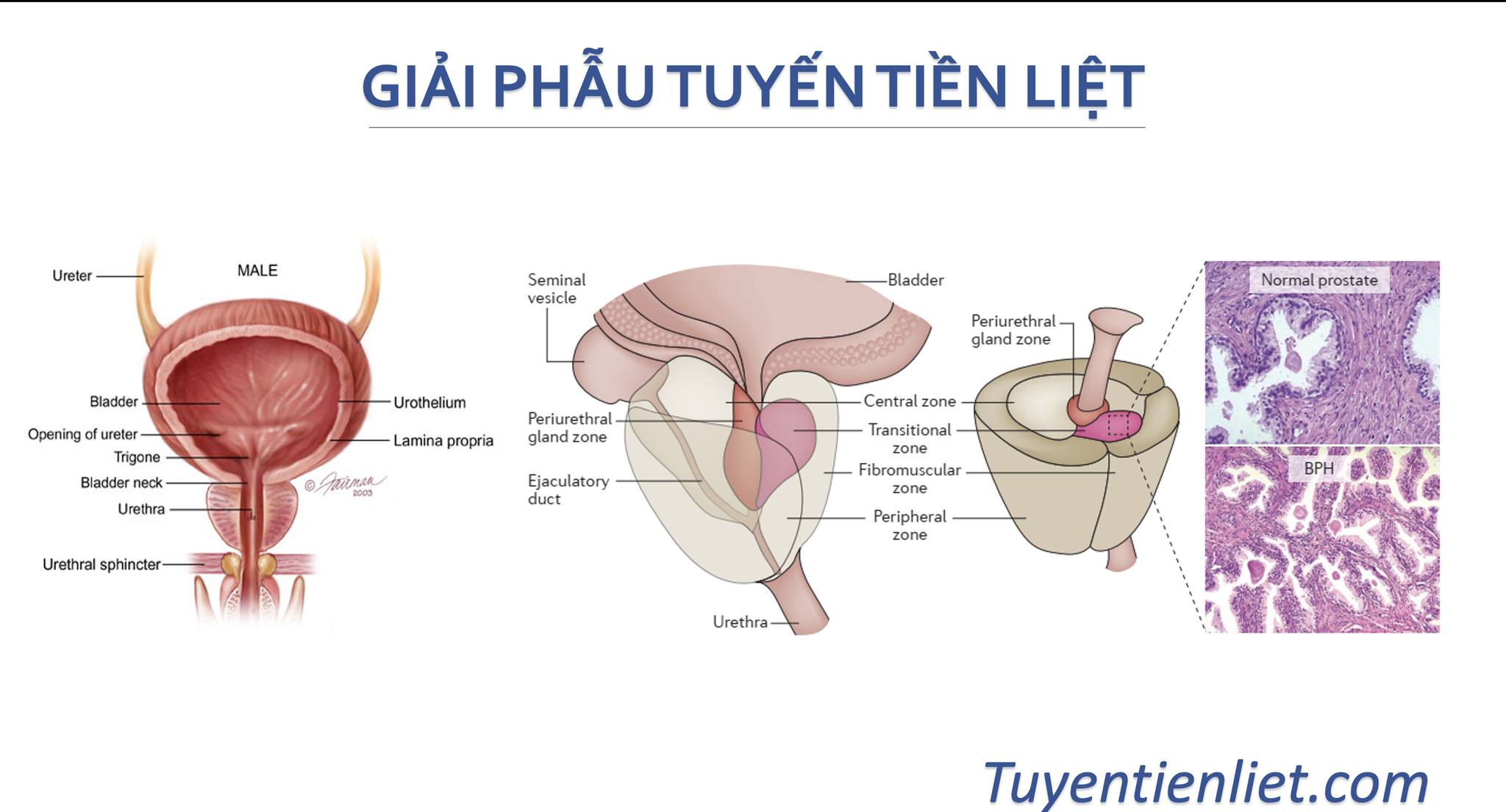 Theo McNeal, giải phẫu tuyến tiền liệt được chia thành nhiều vùng riêng biệt về mặt mô học và chức năng: vùng ngoại vi (Peripheral Zone), vùng trung tâm (Central Zone), vùng chuyển tiếp (Transition Zone), và mô đệm sợi cơ phía trước (Anterior Fibromuscular Stroma). Tăng sinh lành tính tuyến tiền liệt (BPH) chủ yếu là một bệnh lý của vùng chuyển tiếp (TZ), và ở một mức độ thấp hơn là vùng trung tâm (CZ). Vùng chuyển tiếp này bao quanh đoạn niệu đạo gần, ngay dưới cổ bàng quang. Do đó, mục tiêu của điều trị BPH là làm giảm thể tích của khối mô tăng sinh ở vùng trung tâm để giảm sự chèn ép của mô tuyến tiền liệt lên niệu đạo.